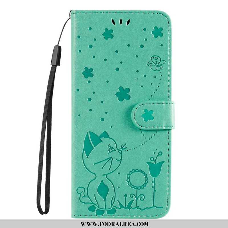 Läderfodral Samsung Galaxy S22 Plus 5G Med Kedjar Katt Och Bi Med Snodd